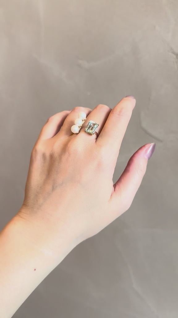 色とりどりの天然石と、純白のアコヤパールのコンビネーションが華やかに指先を彩ってくれるリング。